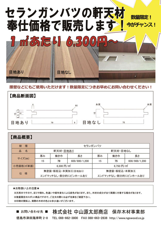 このたびスポット商品として、弊社セランガンバツ材を軒天材として、数量限定で販売させていただくことになりました!