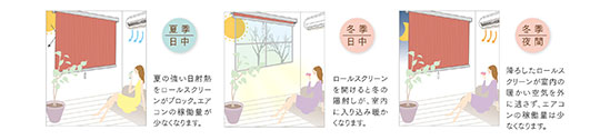 夜間は、ロールスクリーンを閉じて、室内の温度を逃がさないようにすれば、省エネ効果アップ。