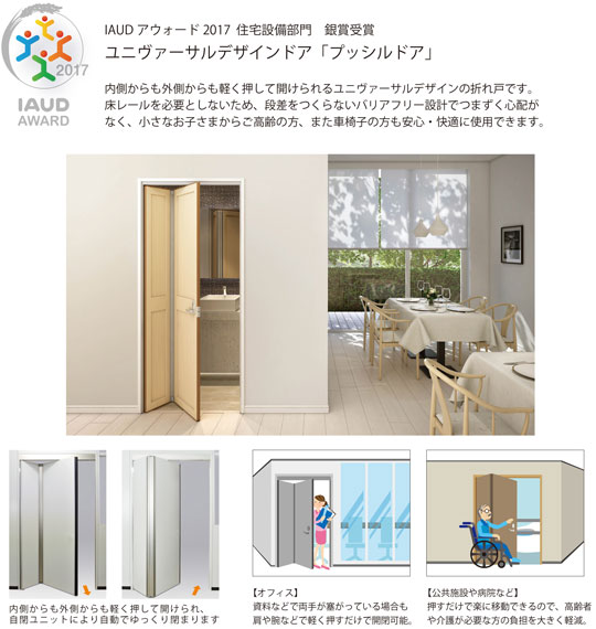 一般財団法人 国際ユニヴァーサルデザイン協議会(IAUD)が主催するIAUD アウォード2017 にて、ユニヴァーサルデザインドア「プッシルドア」「プッシルドアライト」が銀賞を受賞、さらに高遮光ロールスクリーン「ソフィー」 小型ガイドレールタイプ グリップ式もIAUD アウォードを受賞いたしました。