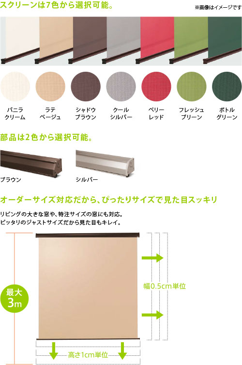 住まいの外観やお部屋のイメージに合わせたカラーと、オーダーサイズに対応しています。