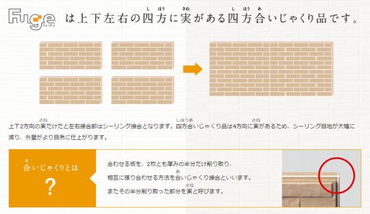 上下左右の四方全てで接合するため、継ぎ目が目立たずキレイな仕上がりが可能。接合部にシーリングを必要としないため壁面の仕上げに一体感を演出します。