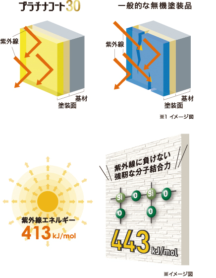 「プラチナコート30」は、分子に443kJ/molの結合エネルギーを持つSi-O結合を含みます。Si-O結合は【紫外線エネルギーの413kJ/molを上回る安定した結合力を持つため、外壁材をしっかりガードすることができます。
