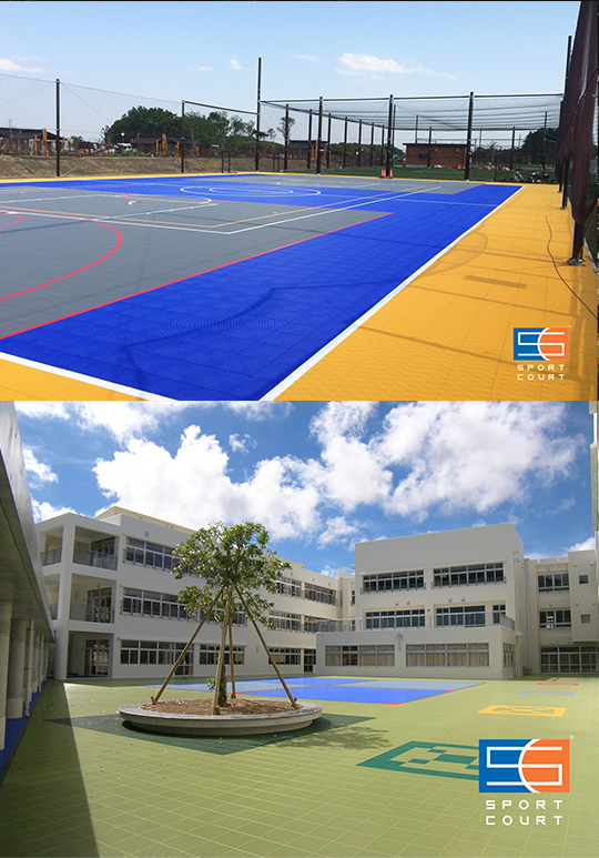 スポーツコートのアウトドアタイプはメッシュ構造で水捌けが良く雨天後の早期使用が可能で、バスケットボール、インラインスケート、フットサル、ハンドボール、テニス及び多目的スポーツで使用されています。プレーヤーの安全性を高めるため衝撃吸収力を強化し、トップレベルの競技に適用できるよう設計されています。 スポーツコートの鮮やかなカラーバリエーションを活かし、タイルの貼り分けで床面にロゴや宣伝要素を取り入れ、床を広告面として活用することも可能です。(※5年間のメーカー保証付き)