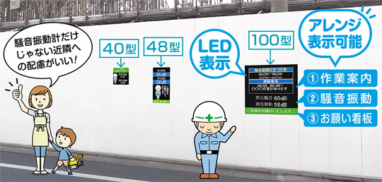 アドフラットエルス専用の騒音計システム・振動レベル計システムで、リアルタイムに騒音・振動レベルを表示することができます。表示の際は作業案内や作業時のお願いなどと合わせて表示でき、複合的な情報発信が可能です。また、騒音計には全天候型ウィンドスクリーン装備で正確な計測が可能、内蔵のSDカードで計測結果の自動収録ができるなど充実の内容となっています。
