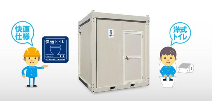 快適トイレ認定(2つ星)を取得した仮設トイレです。洋式便座、男女別表示、除菌クリーナーなど国土交通省の定める快適トイレの認定を取得しています。建設現場はもちろんのこと、イベント会場やトイレの改修工事の際の臨時トイレなど女性や高齢者が使用するシーンにもお使いいただけます。