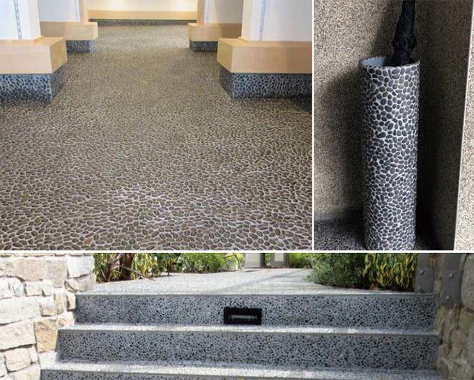 壁への洗い出し仕上げは、従来工法ではとても困難ですが、本商品では、砂利がネットに貼り付いているため比較的簡単に施工できます。また大粒の砂利でも壁や立上りへの施工が可能となり、これまでにない意匠性が実現します。