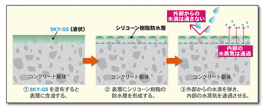 『ハイドロ・スカイ』シリーズの「SKY-GS」「SKY-MX」は躯体上層部にシリコーン樹脂の防水層を形成し、従来のコーティング撥水剤と比較して長期に渡りコンクリート表面を保護します。塩害・凍害・風害等の防止にも効果的です。
