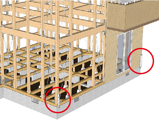 阪神・淡路大震災では、2階建ての木造住宅の1階部分が倒壊してしまった住宅が多く見られました。これは建物を支えている柱が土台から抜けてしまうホゾ抜けなどで、1階の倒壊から家屋全体の崩壊へと繋がったと考えられています。Kホルダー1型は、優れた剛性と粘り強い靭性を併せ持つことによって、基礎・土台・通し柱を強固に一体化し、地震時におけるホゾ抜けを防止します。