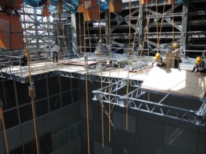 最大12.5m×7.5mの床ユニットを4点で吊り上げ可能。同様に組み上げた床ユニットを立て吊りにして落とし込みが可能。地上での地組み作業を最大限にすることにより高所作業を最小限にし安全性を向上させながら工期の短縮が図れる。