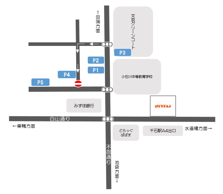 ⽩⼭通りを⽔道橋⽅⾯へ進み、不忍通りとの交差点を20m程過ぎた左側。「洋服の⻘⼭」の2つ⼿前のビルの2F。
