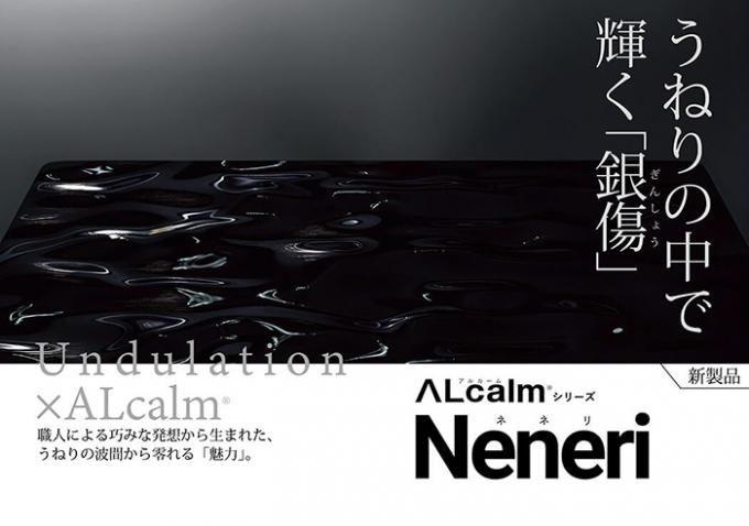 Neneri(ネネリ)は、アルミニウムパネルに特殊な加工を施し、凹凸のある表面に仕上げた意匠建材です。その表面には光沢感があり、周囲をほどよく映り込ませ、うねりと共に魅力的な空間を演出します。また、見る角度や光の影響によって現れる「銀傷(ぎんしょう)」が、幻想的な印象を連想させる光を放ちます。