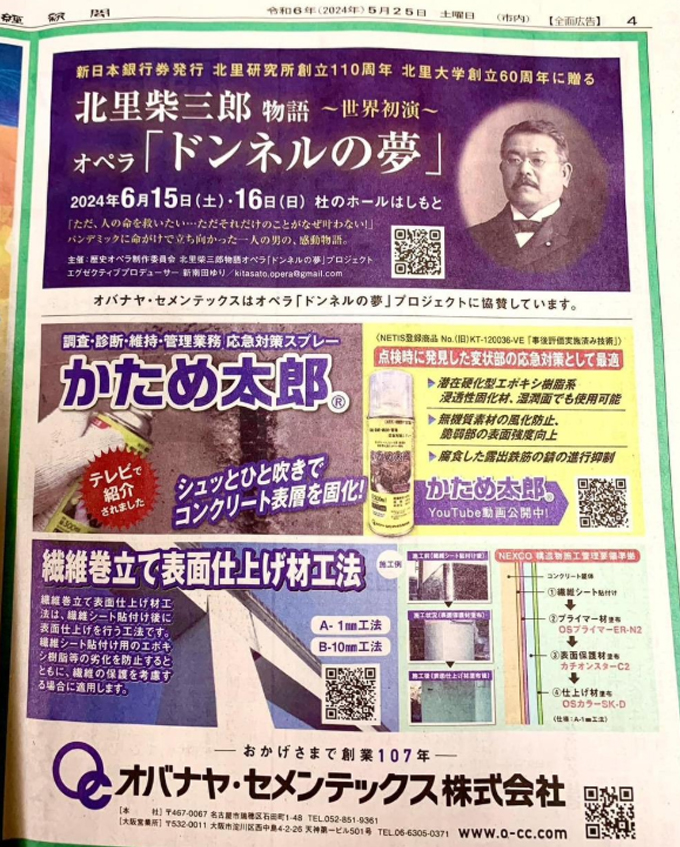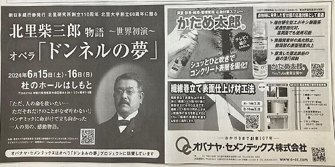6月に世界初演、オペラ北里柴三郎物語「ドンネルの夢」が開催され、協賛している弊社の広告が産経新聞大阪市内版と西日本エリア版に弊社広告が掲載されました。