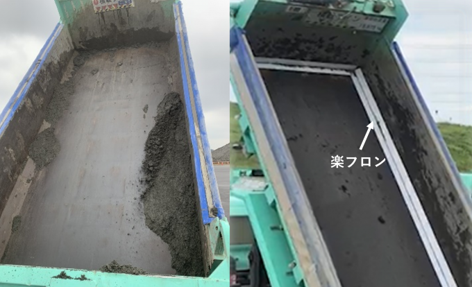 楽フロンは、フッ素樹脂を高強度接合したステンレス鋼板をダンプトラックの荷台の隅角部に設置し、積荷土砂の付着を抑える技術です。運搬効率を損なう荷台の残土の除去作業が大きく削減され、省力化や脱炭素に寄与します。