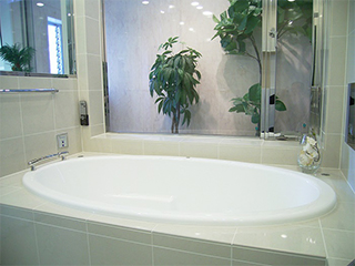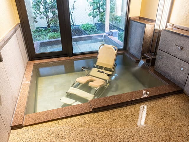 浴室設計にもこだわりました。衛生面を重視し、換気状況を鑑みた窓の設計を依頼。浴室のサイズは、入浴機器の場合は広すぎると“寒い”し、狭すぎると“作業しづらい”ので、コンパクトでありながら搬送車が自由に動けるスペース確保に注意しました。入浴は床が濡れている状態で使用するため、床