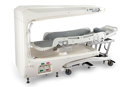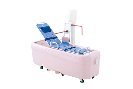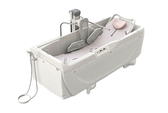 専用ストレッチャー&担架で浴槽に連結し、寝たままの姿勢で入浴するタイプの介護浴槽。