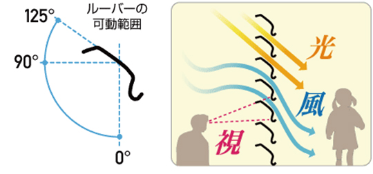 ■ルーバ一角度が、閉じた状態(0°)〜125°(BS3Aに比べて35°アップ)まで調節可能になり、2、3階に設置した場合、下からの視線を遮り、今まで以上にプライバシーを守ります。