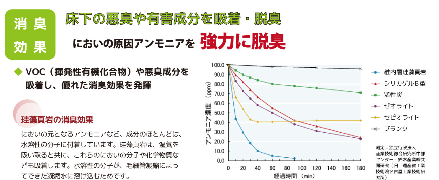 【珪藻頁岩の消臭効果】 においの元となるアンモニアなど、成分のほとんどは、水溶性の分子に付着しています。珪藻頁岩は、湿気を吸い取るとともに、これらのにおいの分子や化学物質なども吸着します。水溶性の分子が、毛細管凝縮によってできた凝縮水に溶け込むためです。
