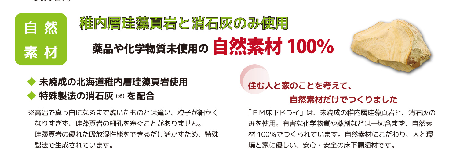 「EM床下ドライ」は、未焼成の稚内層珪藻頁岩と、用石灰のみを使用。有害な化学物質や薬剤などは一切含まず、自然素材100%でつくられています。自然素材にこだわり、人と環境と家に優しい、安心・安全の床下調湿材です。