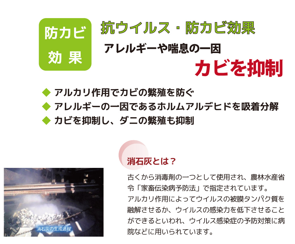 珪藻頁岩の吸湿・放湿効果で半永久的な調湿効果。 嫌なにおいも吸着し、消石灰で高い防カビ効果。