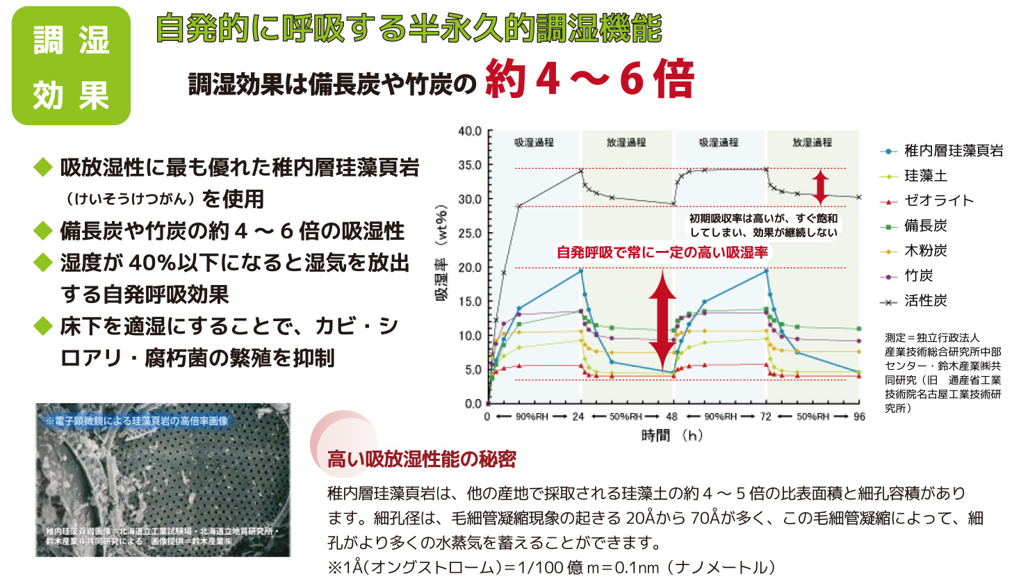 ◆ 備長炭や竹炭の約4から6倍の吸放湿性