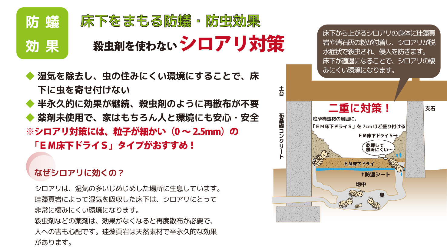 ◆ 薬剤未使用で、家はもちろん人と環境にも安心・安全 ※シロアリ対策には、粒子が細かい(0から2.5mm)の「EM床下ドライS」タイプがおすすめ!