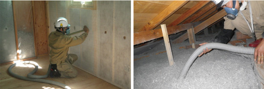 接着剤を使わない「吹き込み施工」と「積もらせ施工」の、専門の技術者による責任施工です。
