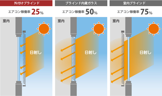 室内ブラインドではエアコン稼働率は75%、ブラインド内蔵ガラスではエアコン稼働率は50%となりますが、外付けブラインドはエアコン稼働率は25%まで抑えることができます。
