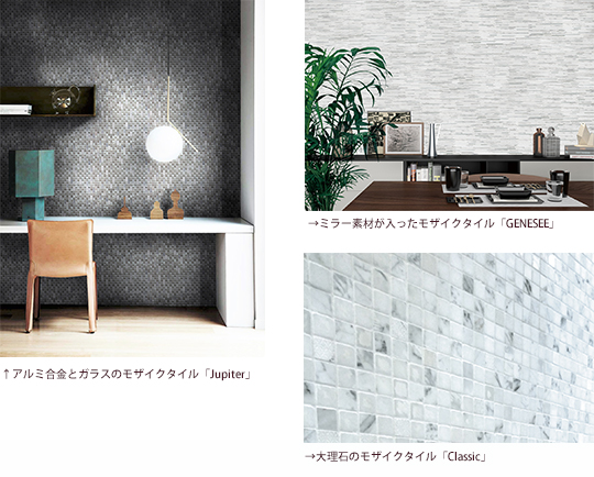 ガラス質のものだけでなく、大理石を混ぜたものや、ミラーを取り入れたモザイクタイルも流行の一つです。空間のアクセントとしていかがでしょうか?