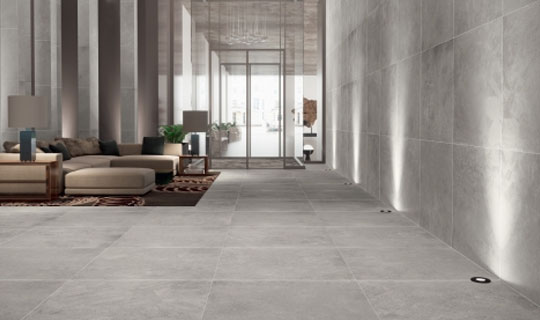 ■繊細な表情を持つ天然石を再現した大判タイル。落ち着いたカラーバリエーションも相まって洗練された意匠を創り出します。