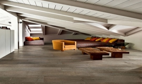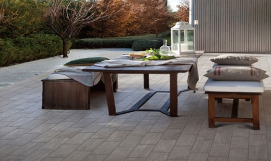 ■イタリア産のストーンを再現した外床タイプのタイル。大判サイズとはまた違った小さなサイズならではの意匠性が楽しめます。壁面にも採用可能で、連続した空間を演出することも可能です。