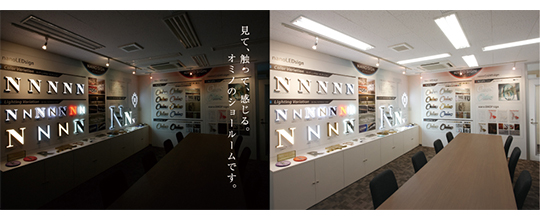 オミノのショールームでは、LEDのサンプル等、各種サインを一望いただける商談室がございます。実際のLEDサインや色温度の違いをご確認いただけます。レンタルを行っておりますので、お気軽にお問い合わせください。