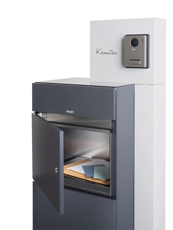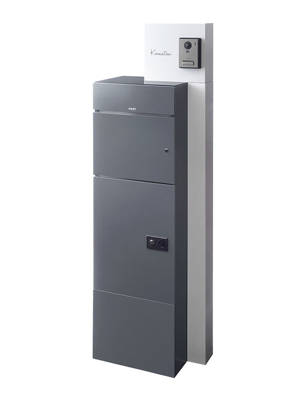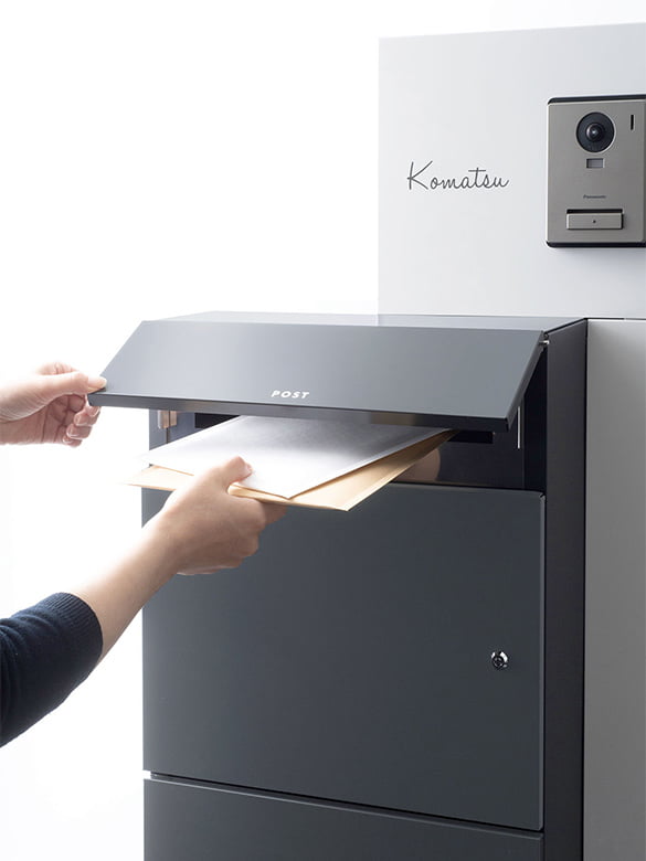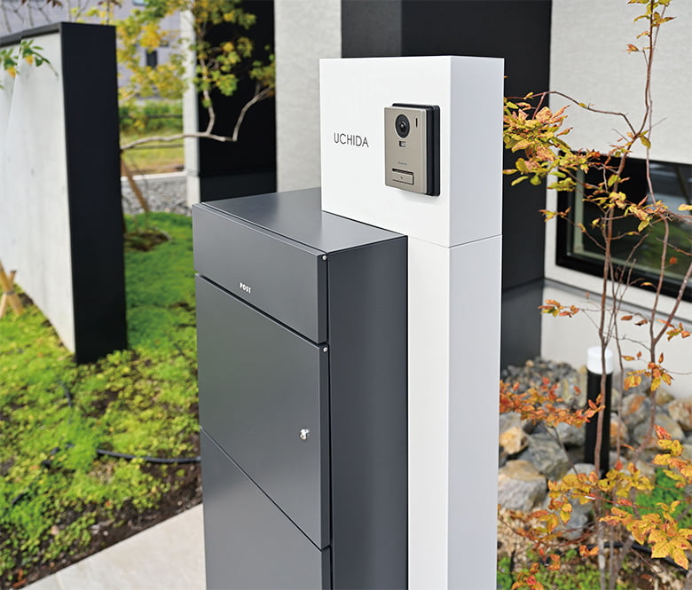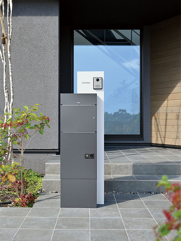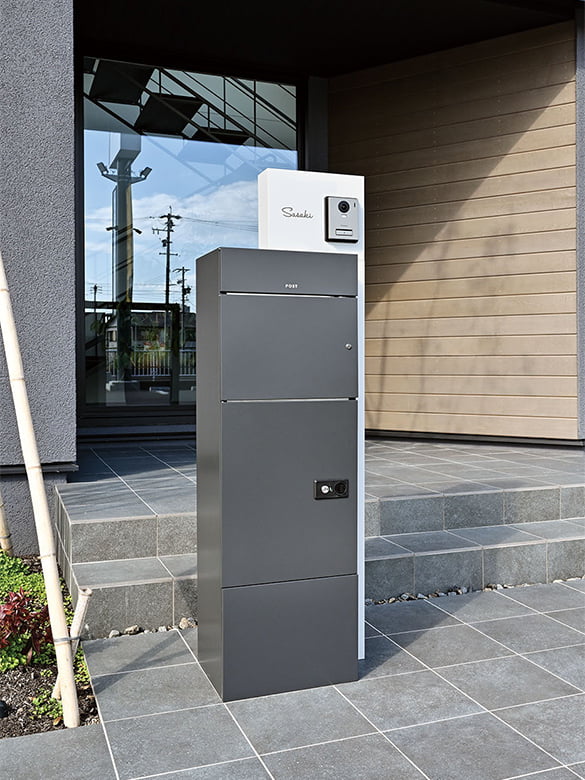 宅配ボックス、ポストが積み重なり、さらに表札とインターホンのL字型のユニットが連結された機能門柱です。シンプルだけれど、ツートンカラーがアクセントになっていることでデザイン性も向上し、おしゃれな印象に。投函・取出しは前入れ前出しの為、狭小地で玄関前にスペースがない場合等でも使いやすい設計です。