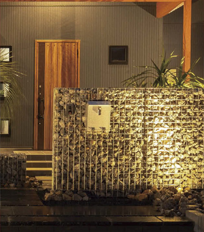 境界線としての塀としてもガビオンは活躍します。石材の凹凸が生み出す陰影が、壁面を表情豊かに彩ってくれます。