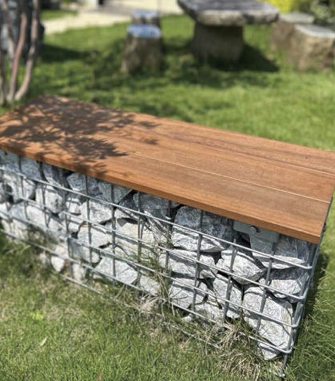 低いガビオンを横に並べれば、ユニークなベンチとしても機能します。上部に木材の座面プレートを置くことで、より快適な座り心地と、異なる素材のコントラストを楽しむことができます。