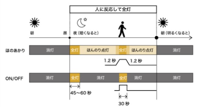 「ON/OFFモード」…夜間照明は点灯していない状態で、不審な人物が近づいた時に瞬時に照明を明るくすることで、姿をあらわにさせ、侵入や窃盗といった犯罪行為の防止に役立ちます。