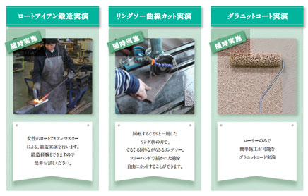 「ロートアイアン鍛造実演」、「リングソー曲線カット実演」、「グラニットコート実演」などの各種実演セミナーも開催いたします。