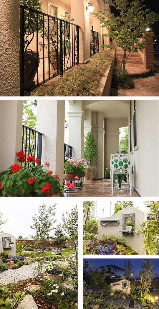 プランツカタログ掲載商品の植栽を外構全体に取り入れコーディネイトされた空間提案。