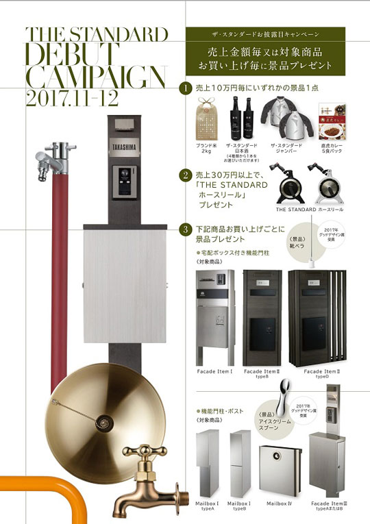 11月~12月の期間中、販売店様、設計事務所様等を対象に、お買上金額毎又は対象商品をお買い上げ毎に景品をプレゼント!