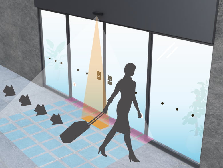検知エリアが狭く、通行者の横切りを取り難いセンサーです。自動ドアのムダ開きを削減し、室内の空調の効率化に貢献します。