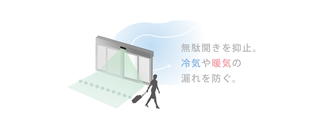 一般的な自動ドアセンサーに比べ、自動ドアの無駄開きを削減し室内の空調の効率化に貢献します。