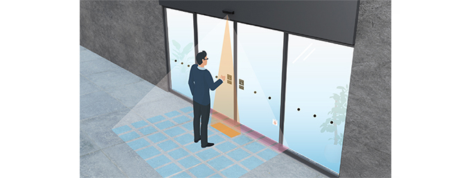 画像技術を用いて、人の歩く速度や進む方向を読み取り、歩く速度に合わせた最適なタイミングで自動ドアを開閉させます。さらに、自動ドアの前を横切るだけの通行者にはドアを開かせないことで安全・快適な通行と不要開閉の削減による省エネの両立を実現しました。