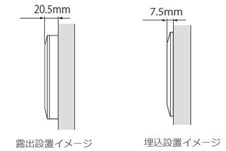 埋込設置時の壁面からの突出は7.5mm、露出設置時も20.5mm(未来工業社製MSW-1W使用時)と壁面デザインを損ないません。