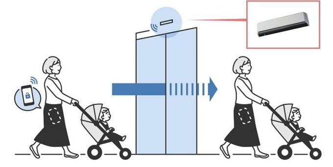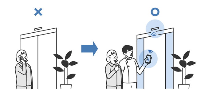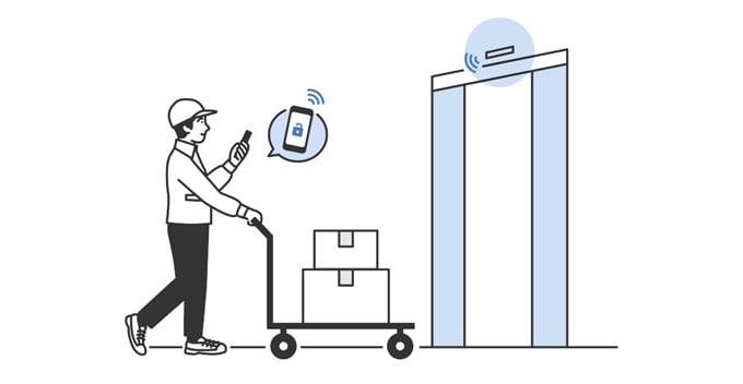 センサーに搭載されたBluetoothと通行者が持つ対応アプリがインストールされたスマートフォンを通信させることで、エントランスのオートロックを解錠しハンズフリー通行を実現します。
