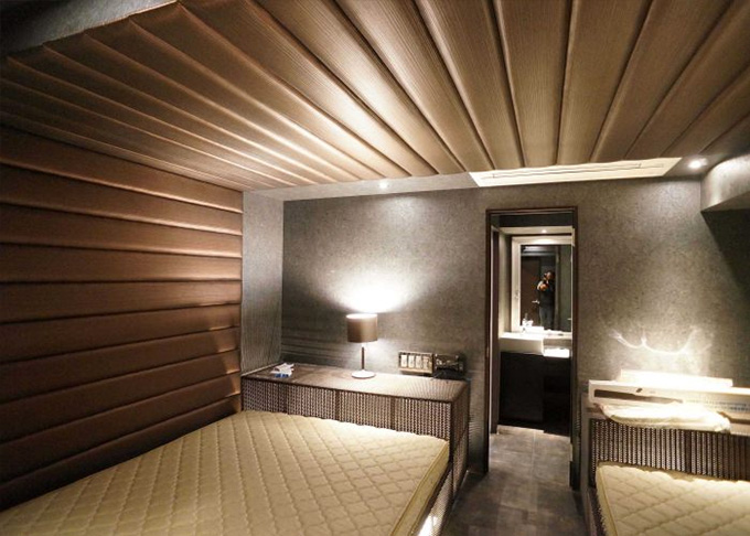 客室の壁面にモダンな布団張り(ブロック)を施工。