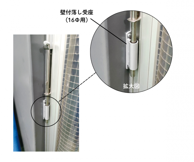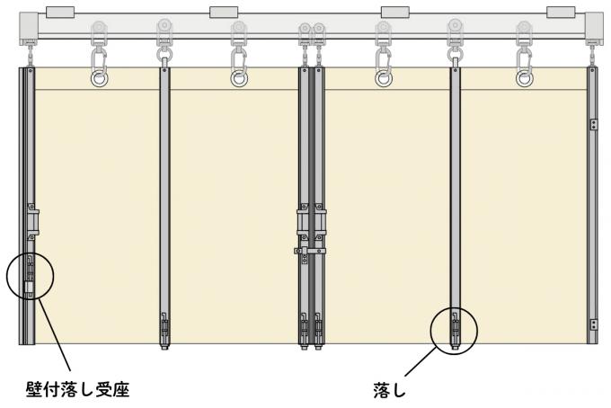 工場・倉庫・作業場などの間仕切り開閉部を固定して、横風によるバタつきを防止。