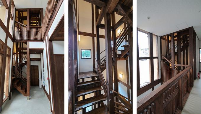 例えば、男山本店店舗の3階部分の床はすべてなくなってしまっていたので、樹種だけ以前と同じ松を採用して新しい木材で復原しました。一方、枠材や天井はすべて、古材が残っていました。