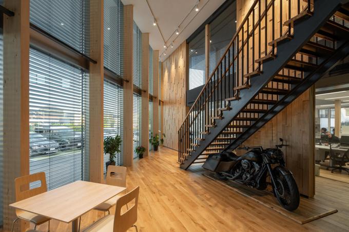 というコンセプトを掲げて建設されたオフィスは、建物で消費する年間の一次エネルギーの収支をゼロにすることを目指した「ゼロエネルギービル(ZEB)」で、CLTを使った木造建築とすることで、CO2放出量の抑制と構造強度を両立されています。