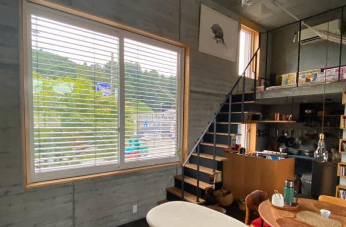 カーテンをつけていないので室内側の窓まわりがすっきりしています。スラットを全閉している状態だと視覚的に防犯上の安心感があります。