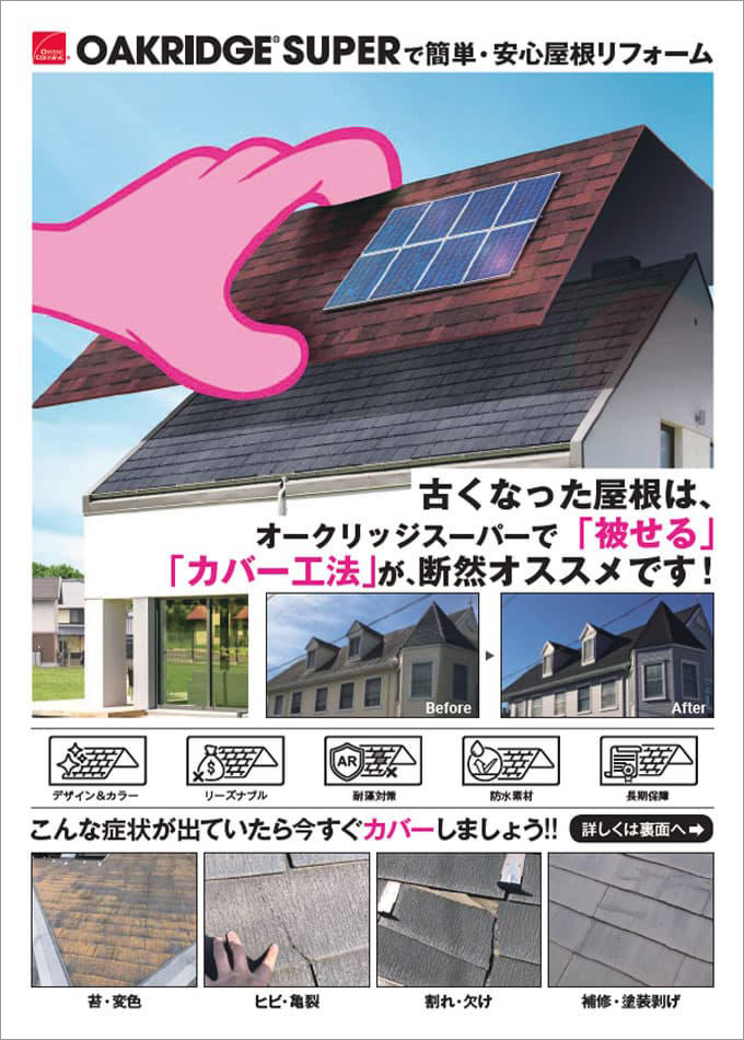 OAKRIDGE SUPER(オークリッジスーパー)のカバー工法は、長寿命で建物にも家計にも優しい屋根リフォーム。野地板が腐っていない等の諸条件を満たせば、既存の屋根の上から新しい屋根材を被すことで短時間かつ経済的に屋根のリフレッシュが行えます。ルーフィング(防水紙)をもう一度葺くので防水性能も復活。全7色のカラーバリエーションでどんな家も美しく変身します。