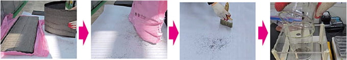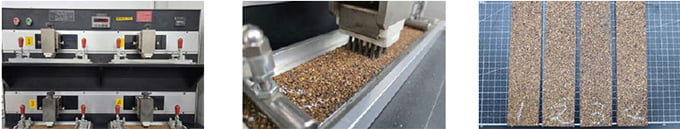 本製品では輸送時や施工時の脱落を加味し製造時に多めに付着した余剰の粒状石(グラニュール)が落ちる現象が見られます。これは製品異常や機能の問題ではありませんが、施工者様とお施主様により満足していただくように落ちる石の量を管理するための自社独自のテストを行っています。